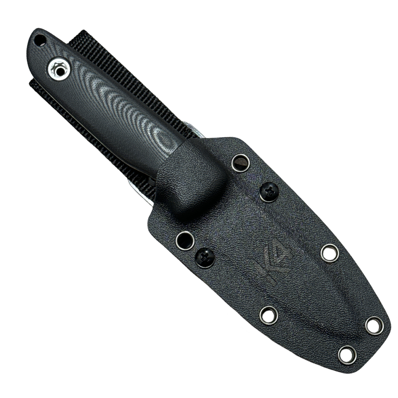 The knife comes with a Kydex sheath, including a textile dangler and a Tek-Lok. The mounting options are suitable for both left- and right-handed users.